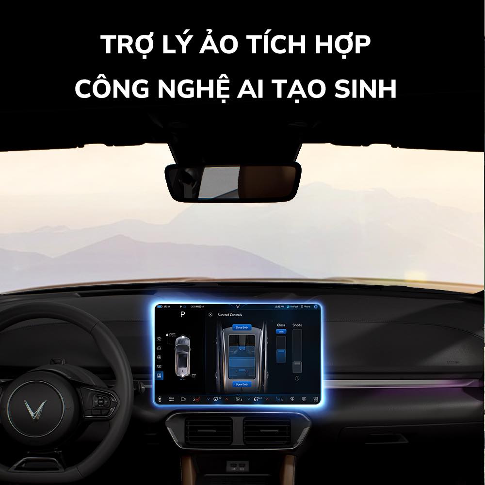 - Màn hình trung tâm 15.6 inch: Trung tâm điều khiển của VF8 là màn hình cảm ứng lớn nằm ngang – đóng vai trò là giao diện điều khiển chính, tích hợp các tính năng giải trí, điều hòa, định vị và điều khiển xe. Giao diện hiện đại, trực quan, hỗ trợ Apple CarPlay, Android Auto và điều khiển bằng giọng nói tiếng Việt.